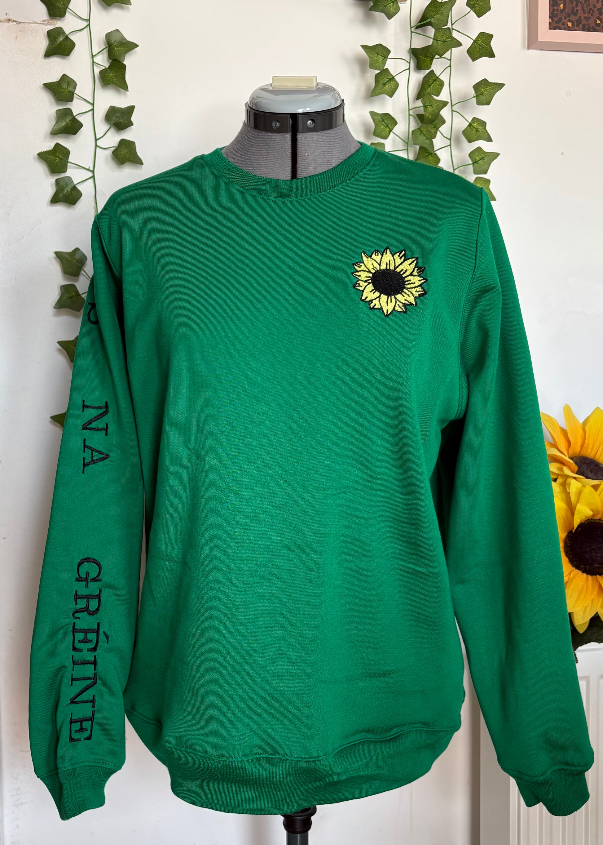 These jumpers have a sunflower embroidered on them and "Lus Na Gréine" written down the right sleeve which is Irish for Sunflower.