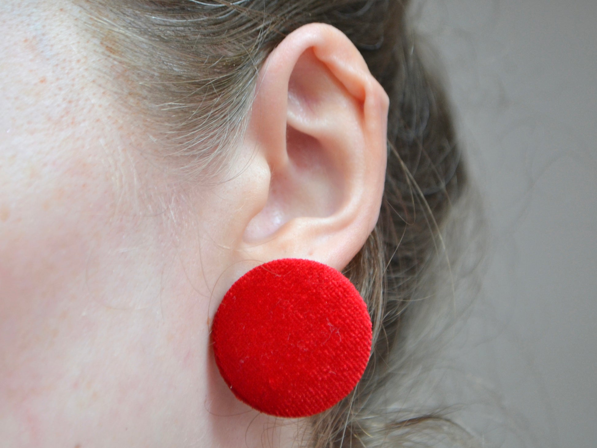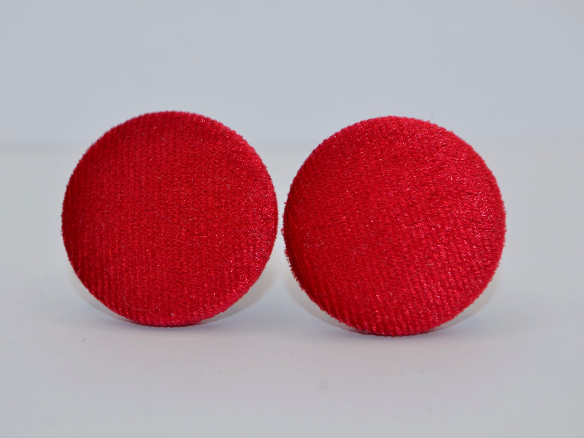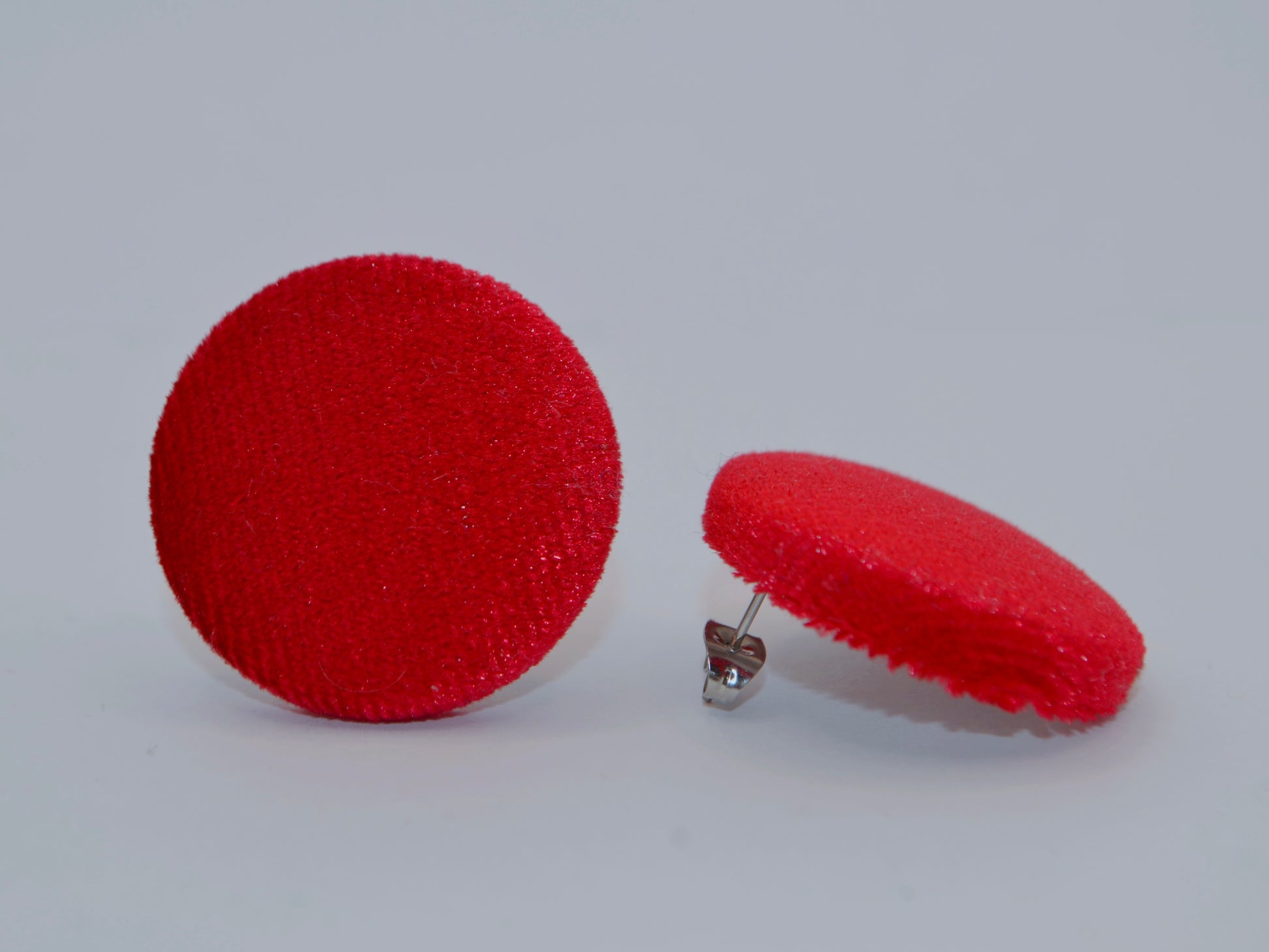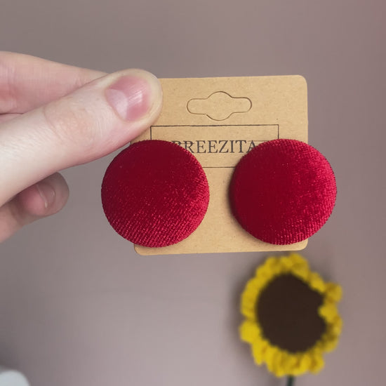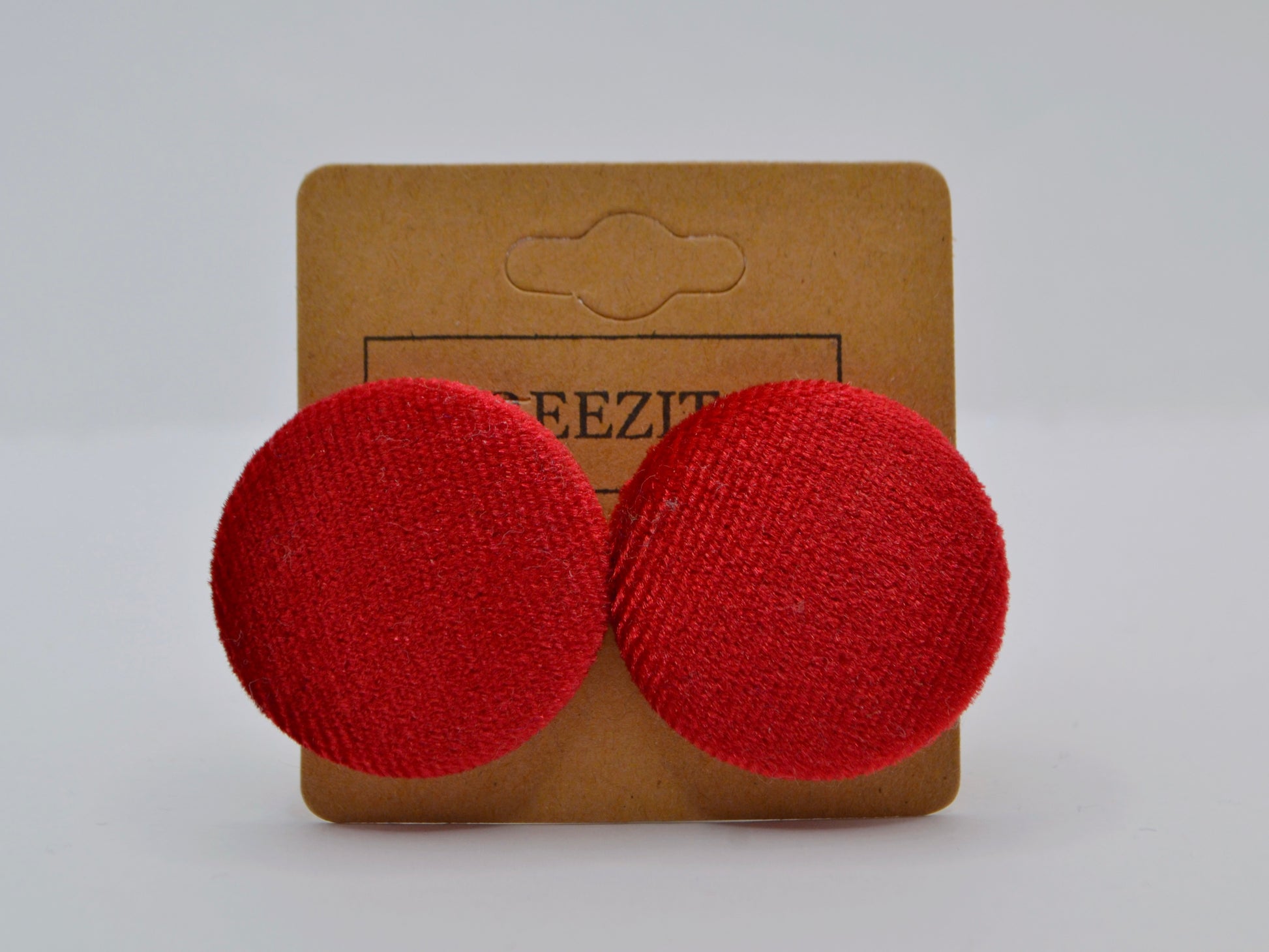 These minimalist Red Velvet Button Earrings are perfect for adding a touch of elegance to any outfit. These red statement earrings feature a large fabric stud earring design, and offer a simple and elegant look that's ideal for both casual and formal occasions. Whether you're dressing up or keeping it casual, these earrings are sure to complement your style. Order now and elevate your look with these beautiful and timeless velvet button earrings.