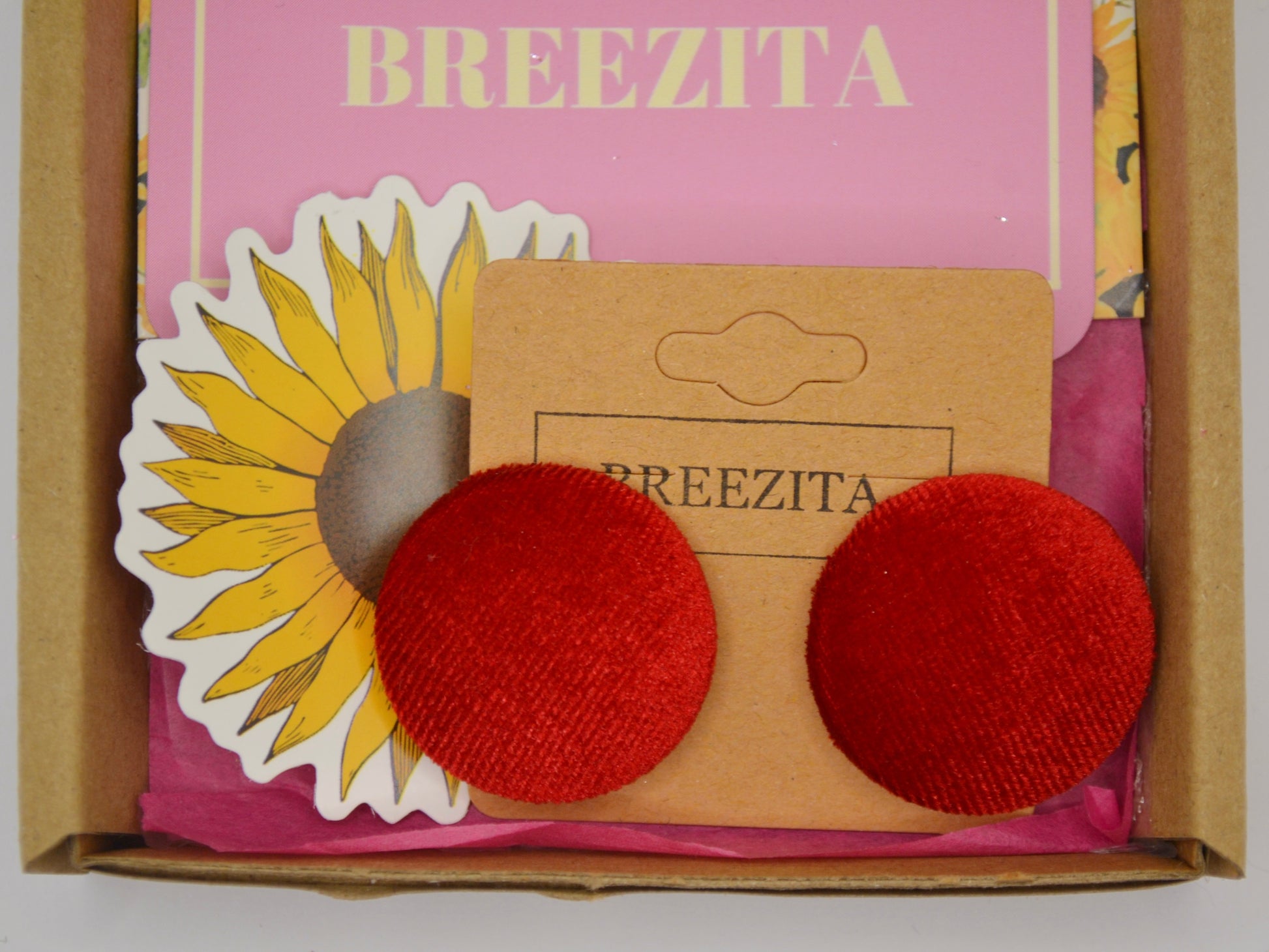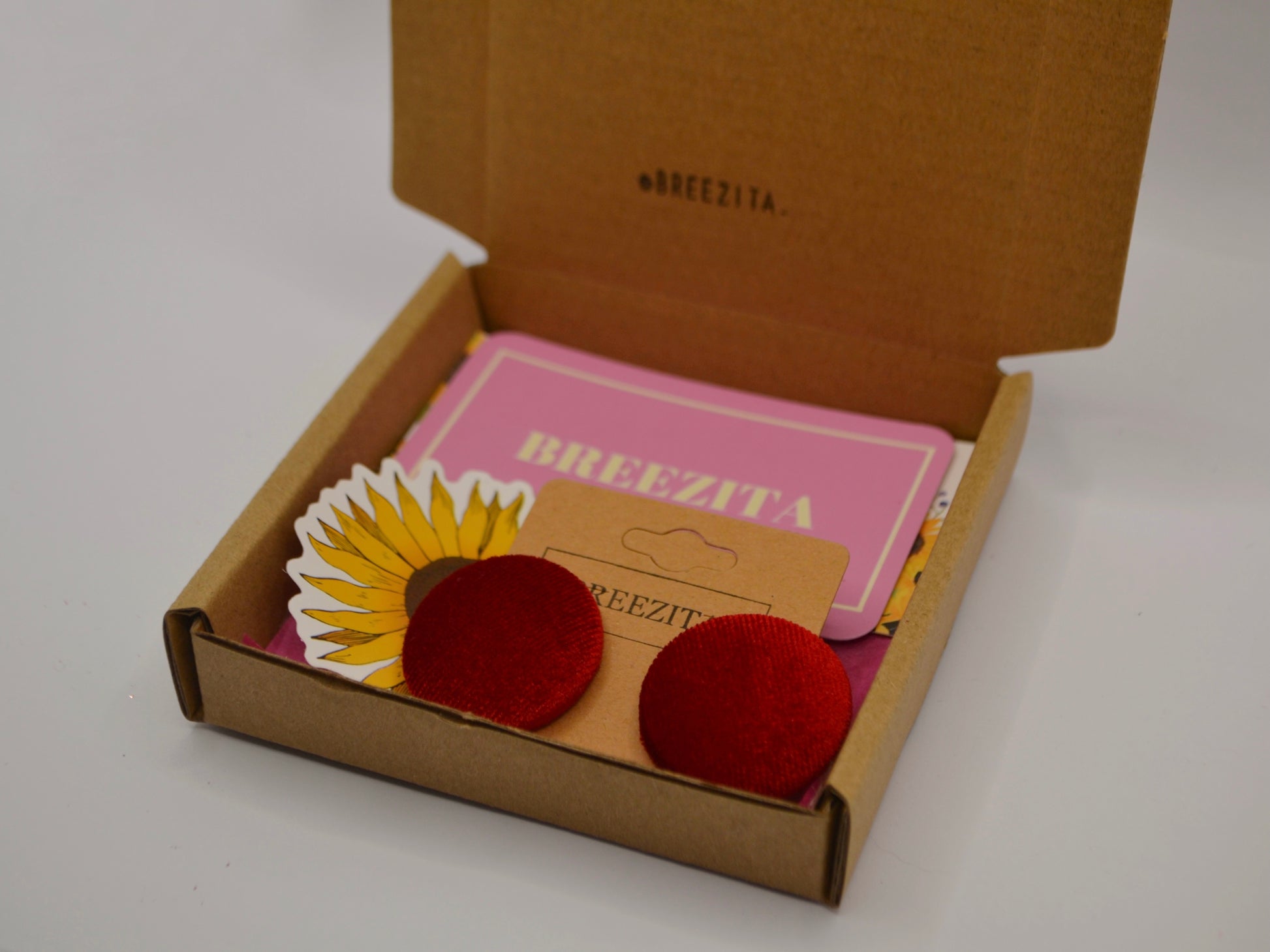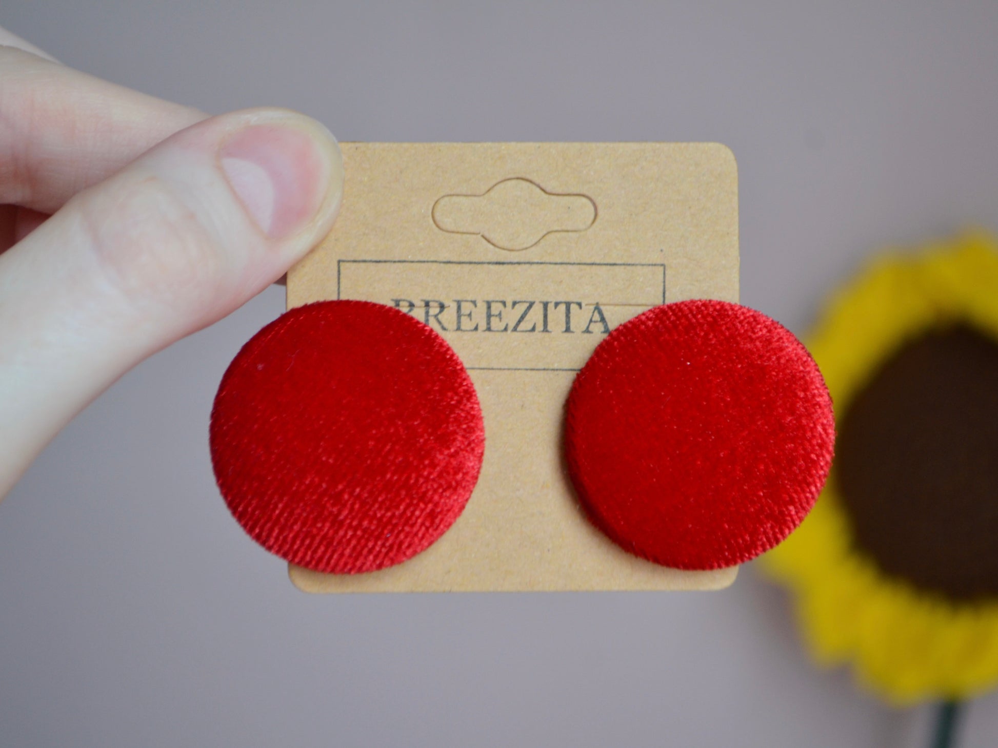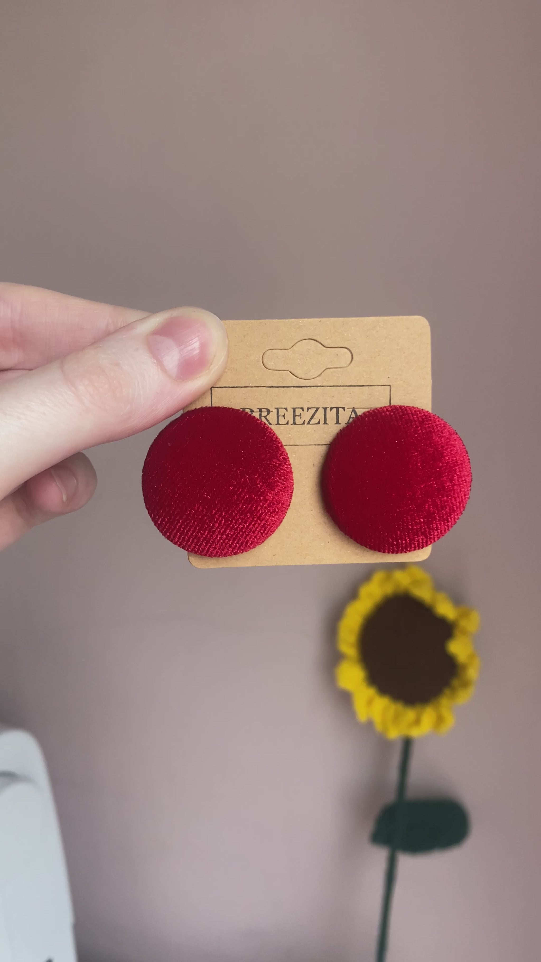 These minimalist Red Velvet Button Earrings are perfect for adding a touch of elegance to any outfit. These red statement earrings feature a large fabric stud earring design, and offer a simple and elegant look that's ideal for both casual and formal occasions. Whether you're dressing up or keeping it casual, these earrings are sure to complement your style. Order now and elevate your look with these beautiful and timeless velvet button earrings.