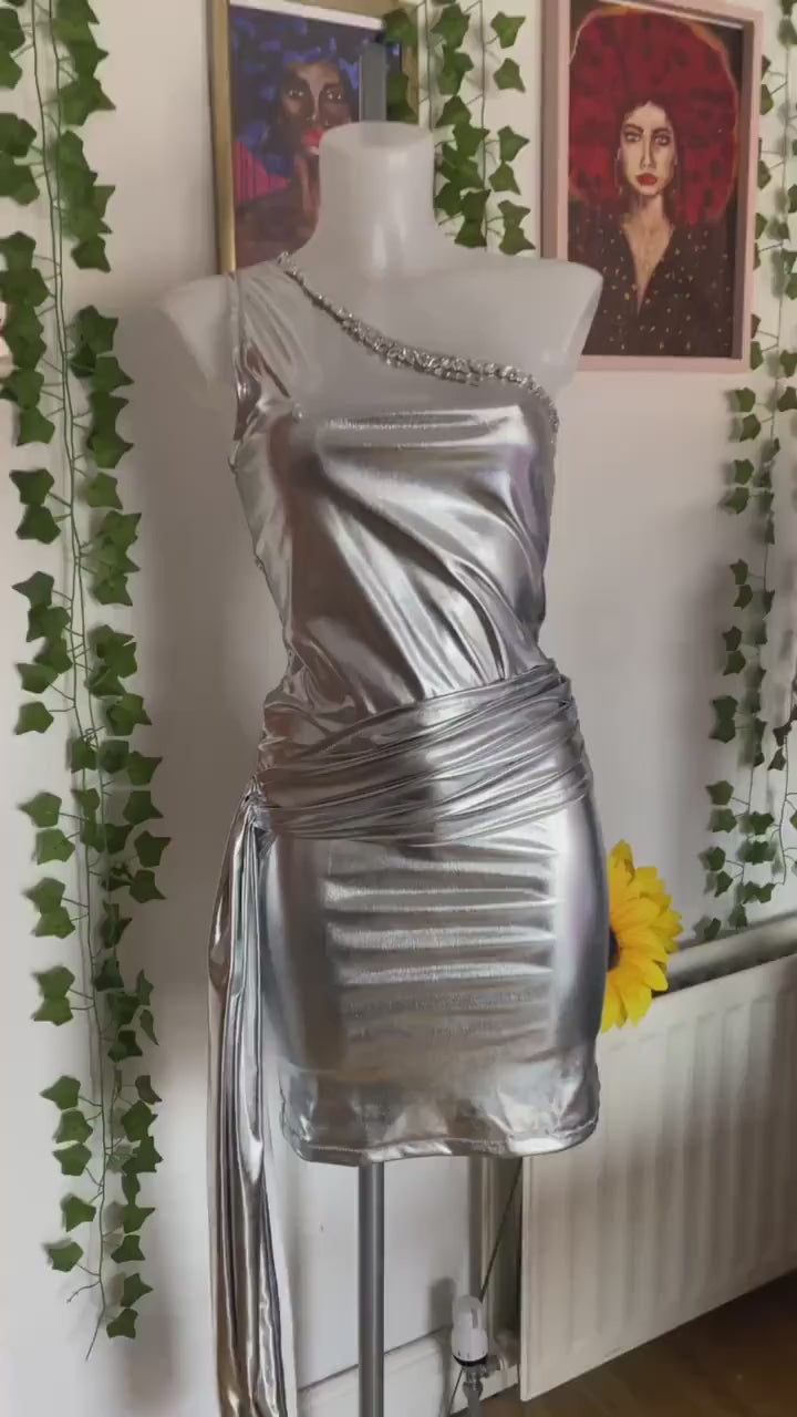 Make an unforgettable entrance with our Silver Starlight Dress, featuring a shimmering silver foil fabric, luxurious diamond trim, and a sophisticated draped side ruffle. This one-shoulder statement piece is designed to dazzle at any event, from Christmas parties to glamorous evenings out.