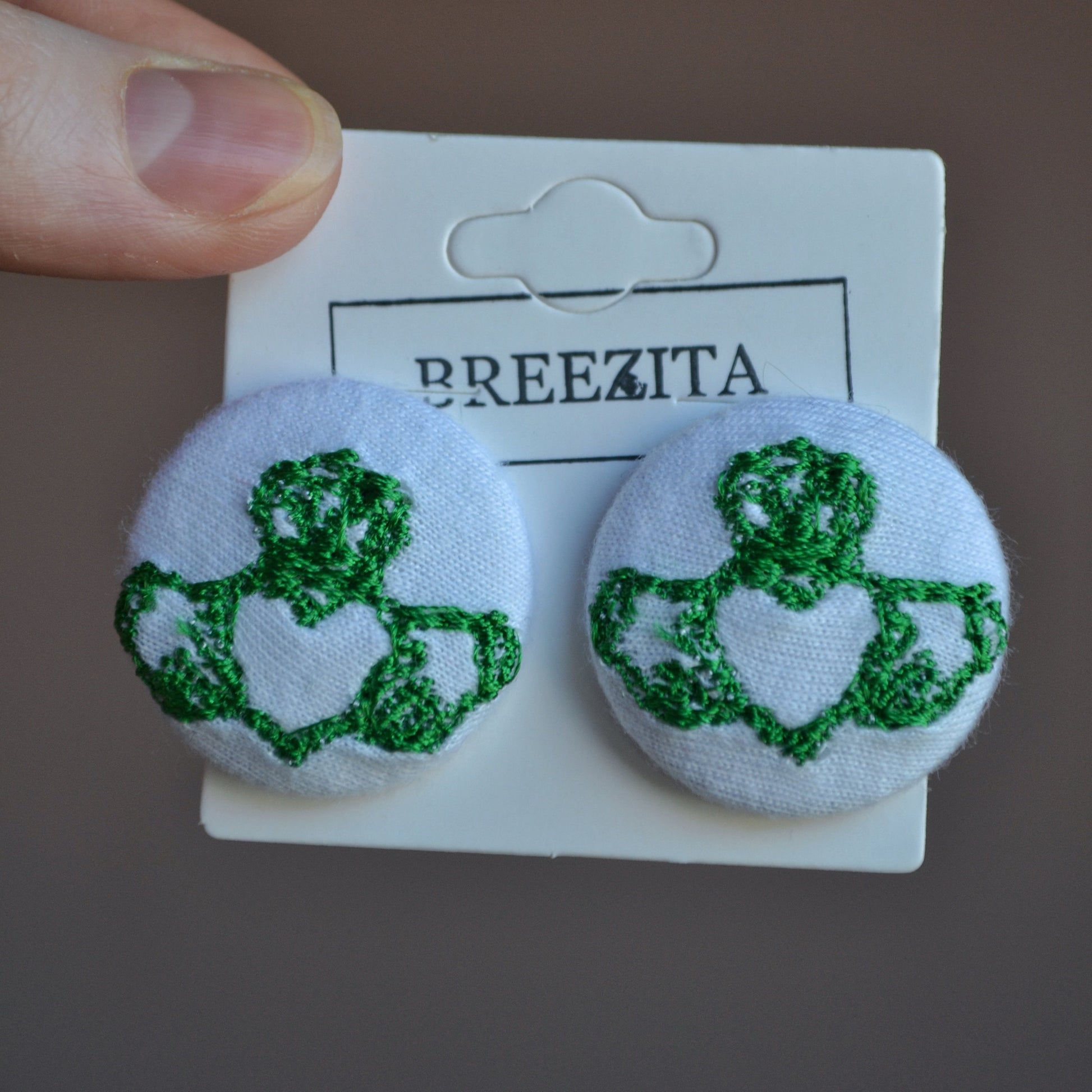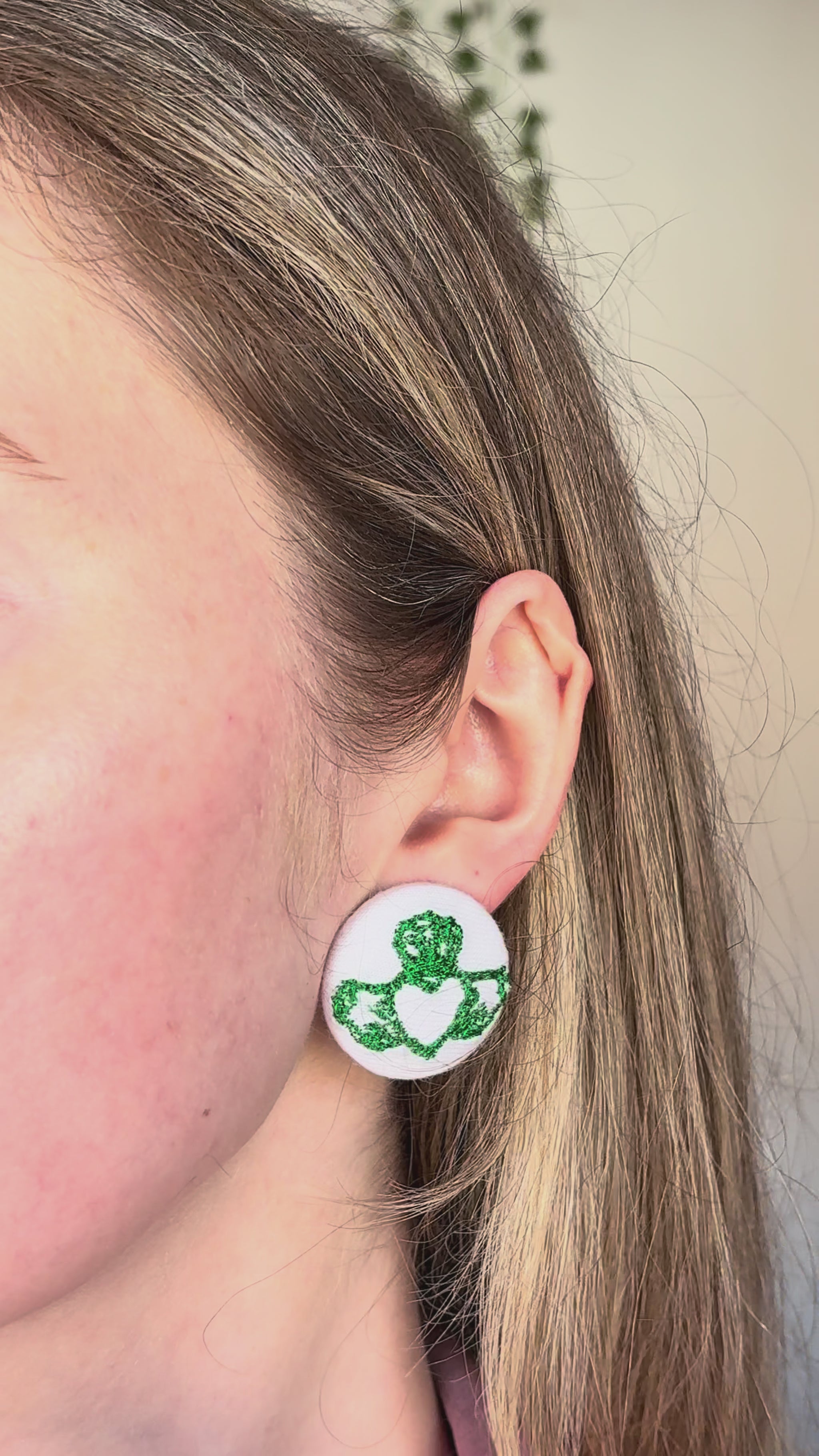 Inspired by the traditional Irish Claddagh symbol, each pair features an embroidered heart, hands and crown stitched onto soft fabric button studs or clip-ons. Lightweight yet bold, they’re designed to add a meaningful statement to your everyday look.